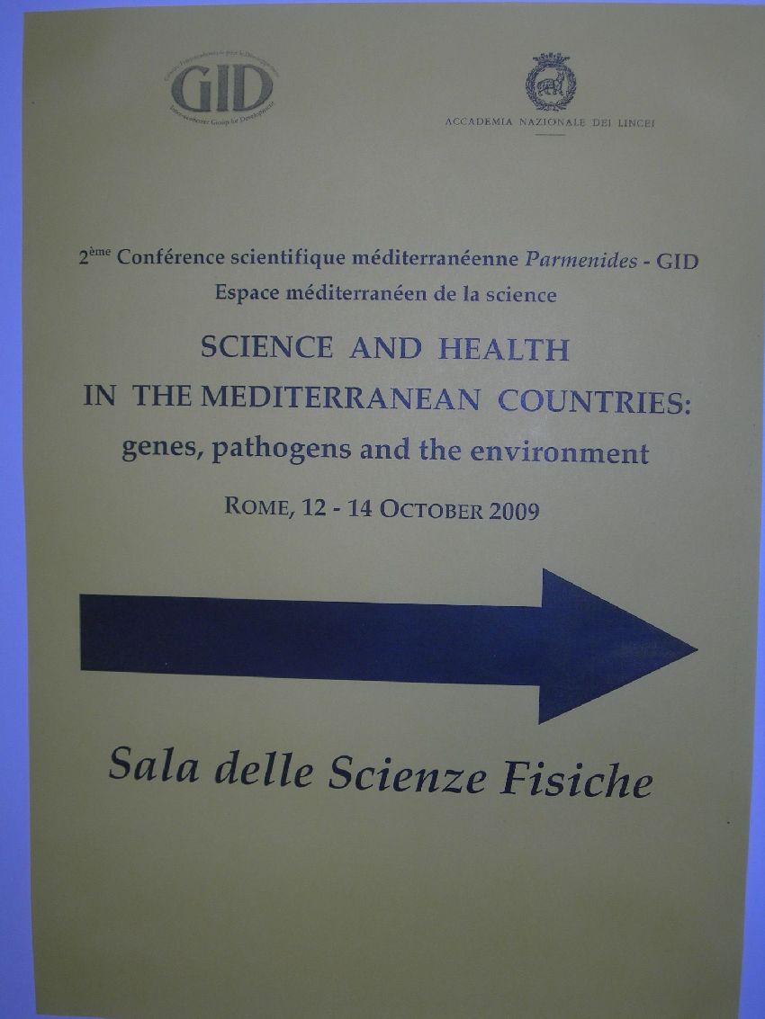 Dans le cadre de l’Espace Méditerranéeen de la science, la deuxième conférence scientifique GID-Parmenides s’est tenue dans les superbes locaux historiques du Palazzo Corsini du 12 au 14 octobre 2009. S’y sont réunis les représentants de 19 académies des sciences de la Méditerranée pour traiter ensemble de Science et Santé en Méditerranée, Gènes et environnement.