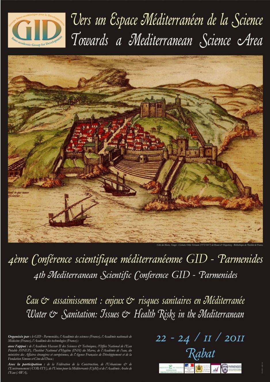 A ces risques infectieux, s’ajoutent les dangers accrus liés aux polluants organiques L’urbanisation explosive et particulièrement la littoralisation massive liée au développement considérable du tourisme implique la mise en place prioritaire de stratégies de développement sanitaire en Méditerranée, non seulement dans les zones rurales mais aussi dans les régions côtières. Ici encore l’accès à l’eau potable, le contrôle étendu de la qualité de l’eau, une politique intensive d’implantation d’équipements sanitaires, l’éducation à la santé constituent le cœur d’un réseau fondamental d’actions préventives dans ce domaine. Voilà donc l’essentiel de la IVème Conférence Parmenides qui nous réunit aujourd’hui. Elle n’aurait pu avoir lieu dans le concours permanent et décisif de nos collègues marocains, les Professeurs Albert Sasson et tous ses collaborateurs. Une mention toute particulière doit être faite au remarquable soutien de l’Académie Hassan II des sciences et techniques, de l’Office national de l’eau potable (ONEP) et de l’Institut international de l’eau et de l’assainissement (qui nous accueille aujourd’hui dans ses locaux, de l’Institut National d’hygiène du Maroc ; que tous soient profondément remerciés pour le rôle éminent qu’ils ont joué et pour l’hospitalité qu’ils nous accordent. J’aimerai également remercier pour leur participation, l’Académie des technologies de France, l’Académie nationale de médecine, l’Académie des sciences, l’Académie de l’Eau, l’Académie Arabe de l’eau. L’aide matérielle de l’Agence Française de Développement, du Ministère des Affaires étrangères et européennes, et de la Mission interministérielle Union pour la Méditerranée a été essentielle et suscite toute notre gratitude. Que soient également remerciés mes collaborateurs Jacques Fröchen et Francis Segond dont l’inépuisable dévouement et le talent sont eu cœur de la réussite de cette rencontre. L’ensemble des conclusions et recommandations qui seront issues de cette conférence, sera largement diffusé sur le site du GID (g –i-d.org). Il est prévu pour clore ce premier cycle de conférences après Paris, Rome, Alexandrie, Rabat, d’organiser de retour à Paris, une conférence de synthèse et de prospective. Cette 5ème conférence Parmenides V« Vers une vision intégrée du développement scientifique en Méditerranée » se tiendra le 20 et 21 Mars 2012 à l’Institut de France avec un double objectif :